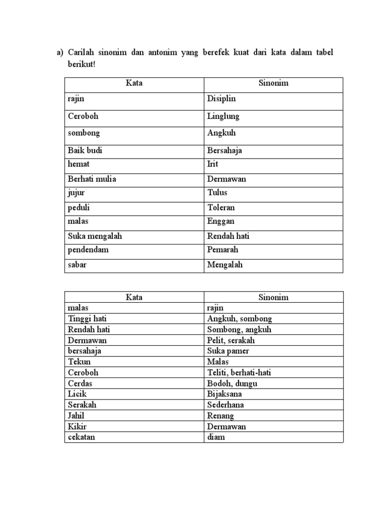 Kata Sinonim Rajin Ceroboh Sombong Baik Budi Hemat Berhati Mulia Jujur Peduli Malas Suka Jawab Soal